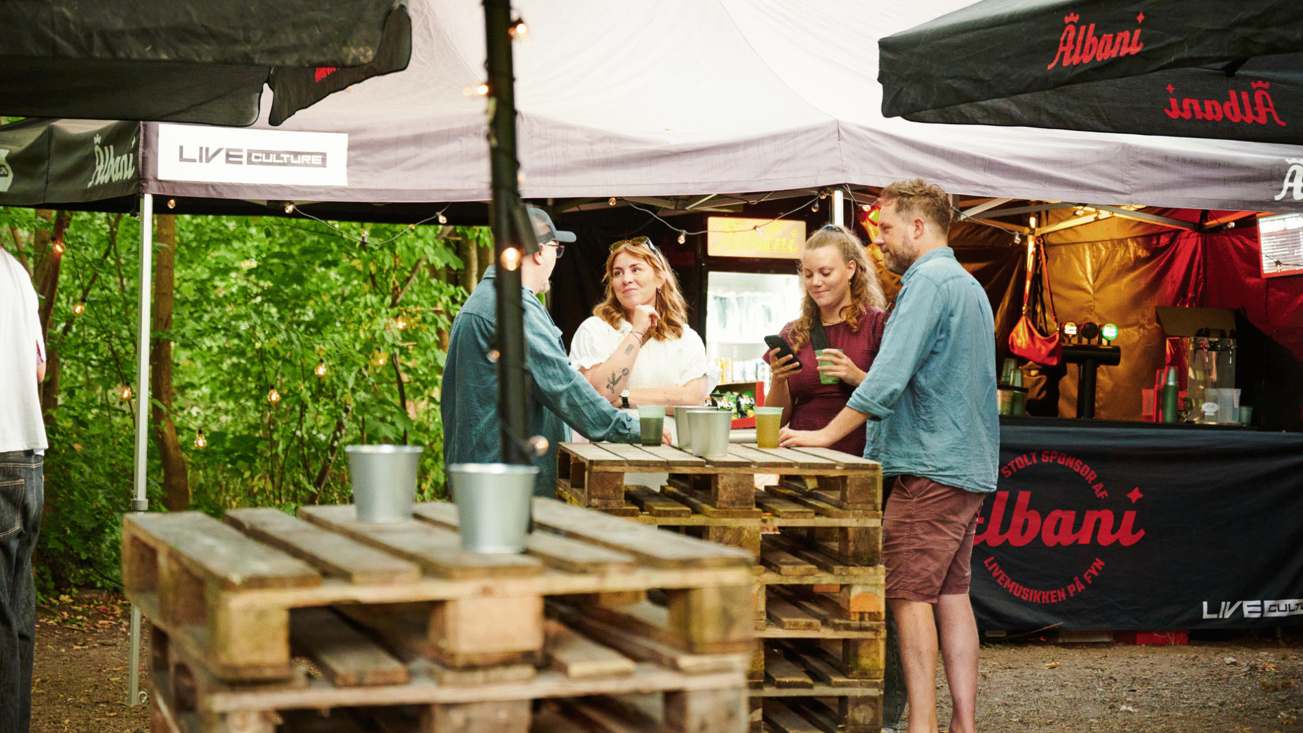 Der er tre områder der kan benyttes til selskaber: Skovens Harmoni, Albani Ølhytten og Tipi’en på plænen.